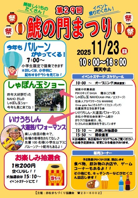 赤松まちづくり協議会では、11/23(日・祝)に「第29回鯱の門まつり」を開催します。地域住民による出店、キッチンカ―などの飲食店が出店するほか、メインステージでは演奏や踊りの披露があります。また「バルーン係留(赤松小児童限定)」「しゃぼん玉ショー」「大道芸パフォーマンス」などの催しもあります。そして!!毎年大盛り上がりの「大抽選会」は、今年も1000個の賞品を準備しています。多くの皆様のご来場をお待ちしております!