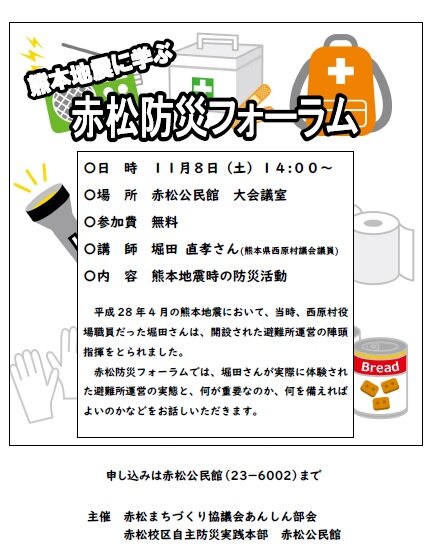 赤松まちづくり協議会あんしん部会、赤松校区自主防災実践本部、赤松公民館の共催で、赤松防災フォーラムを開催します。熊本地震における避難所運営において、陣頭指揮を取られた堀田直孝さん(現・熊本県西原村議会議員)のお話をお聞きします。