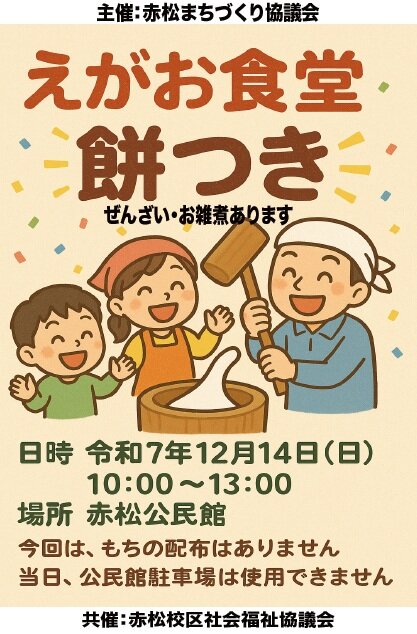 12/14(日)10:00〜13:00 赤松まちづくり協議会・赤松校区社会福祉協議会主催のえがお食堂・もちつき会を開催します。杵と臼でのもちつき体験や、つきたておもちの試食など楽しいイベントが盛りだくさんです。赤松校区民のみなさ〜ん!もちつき会にどうぞお越しください〜!