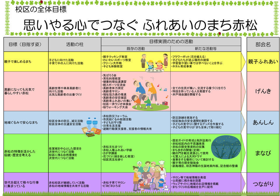 赤松校区では、「思いやる心でつなぐ ふれあいのまち赤松」を校区の目標に掲げ、地域住民が安心して住み続けることができるまちづくりに取り組むため、平成29年7月「赤松まちづくり協議会」を発足しました。