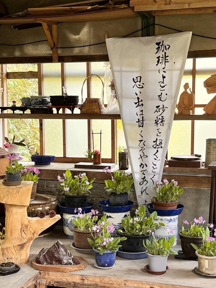 さらに奥に進むと、あずまやが見えてきて中に入ると、庭の草花を鉢に入れ、亡きお母さんが詠んだ俳句を飾ってあるのだが、とても情緒豊かな気持ちなる。![]()