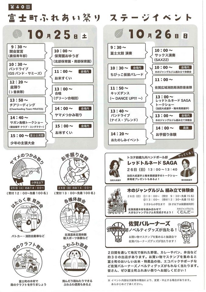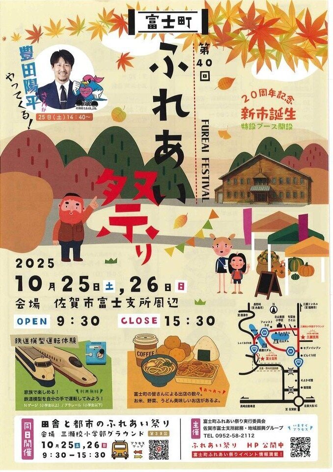 富士支所周辺で第40回ふれあい祭りが開催されます。今年は、サガン鳥栖の豊田陽平さんが25日に来場。
