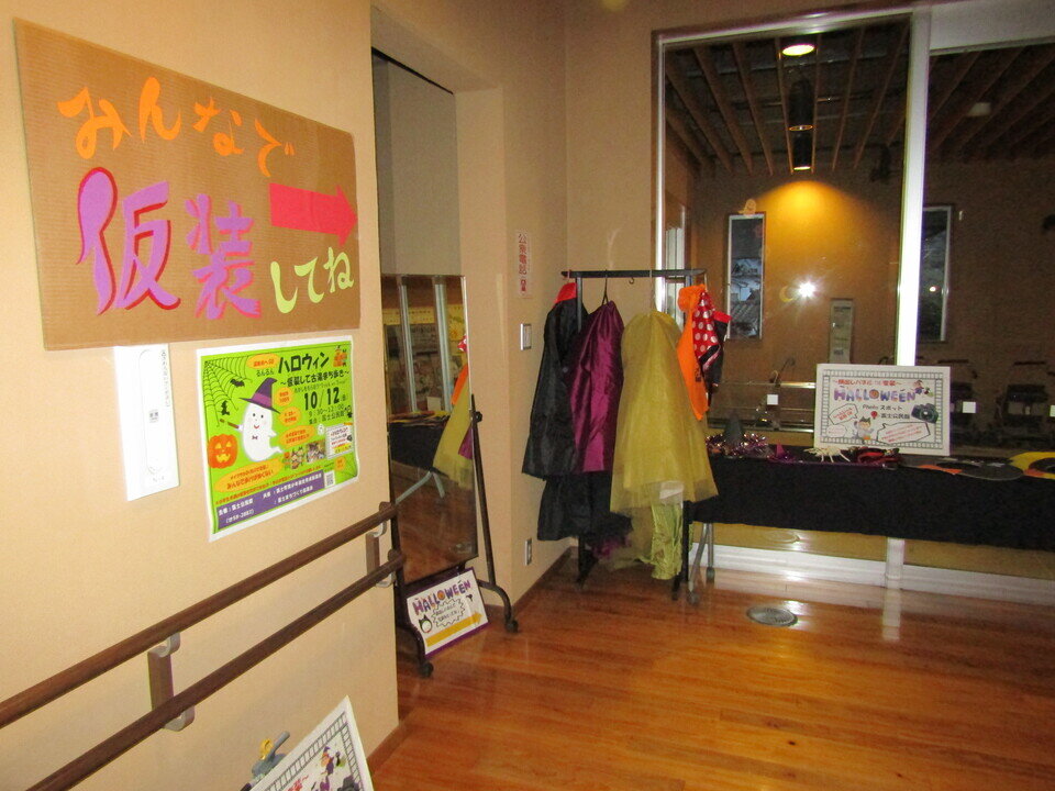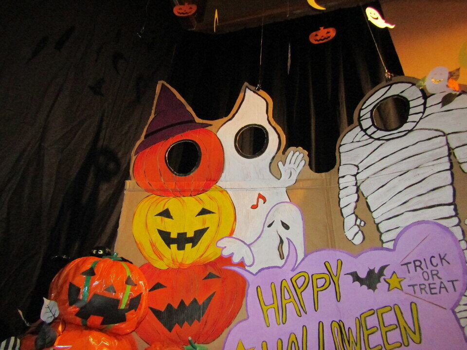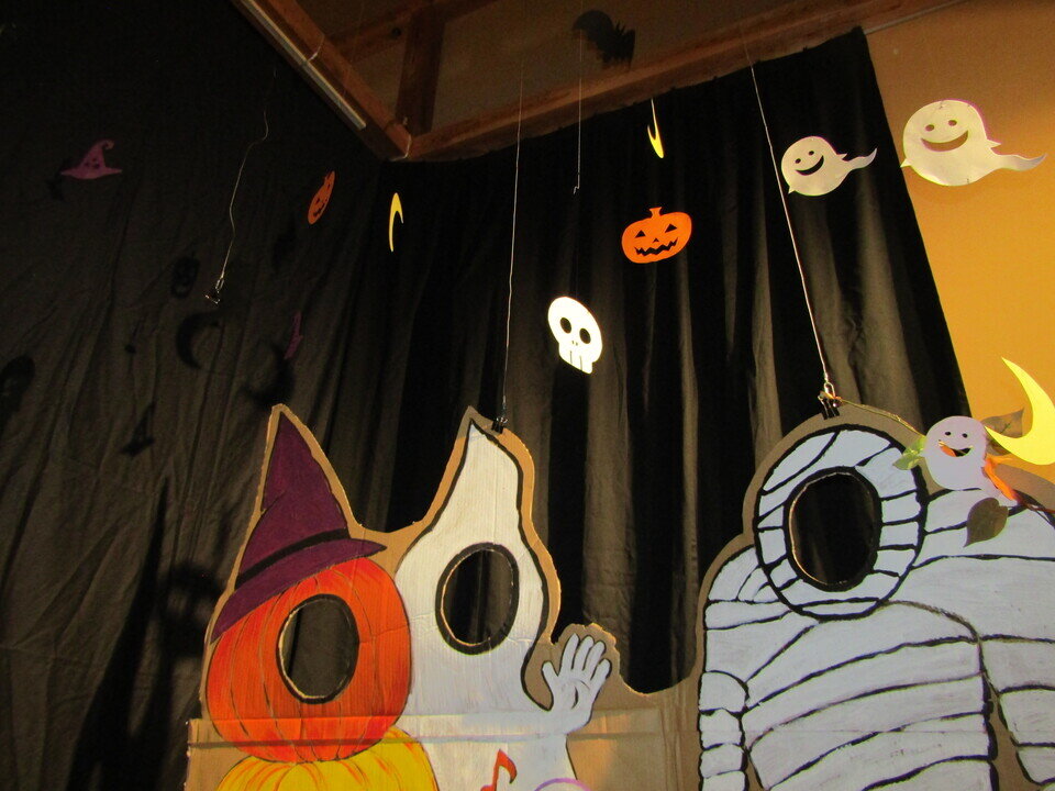 10月12日(日)のハロウィンパレードに合わせて、公民館玄関に顔出しパネルや変身コーナーができました。