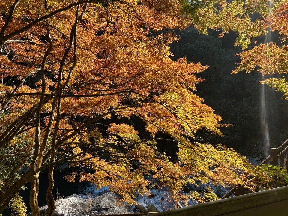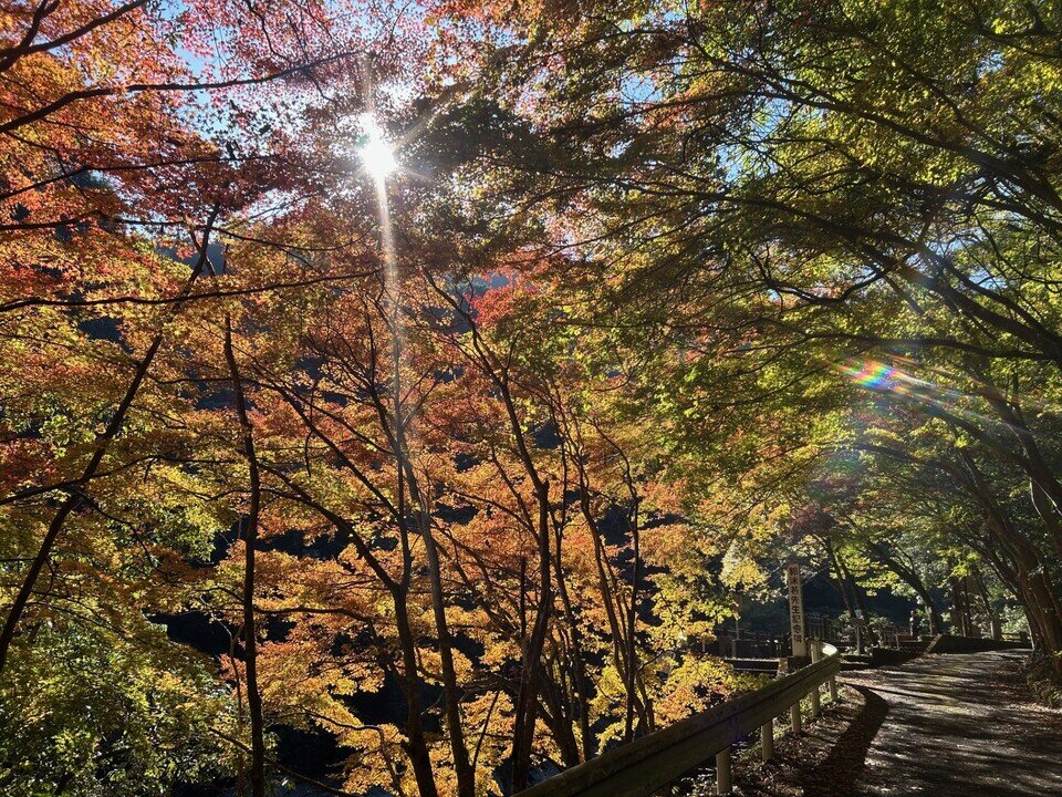 富士町の紅葉で欠かせないのが雄淵雌淵公園です。紅葉のトンネルは歩いてぜひ通ってもらいところです。ここは、谷の底になるので日が入るのが早く午後3時前には日陰になってしまいます。太陽の光に照らされたモミジがきれいなので早い時間に行くのがおすすめです。
