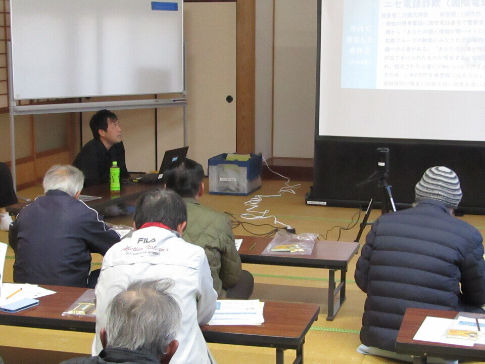 佐賀市生活安全課から「佐賀市内で発生してるニセ電話詐欺とSNS型投資詐欺・ロマンス詐欺の状況と対策」について具体例とともにわかりやすく説明していただきました。