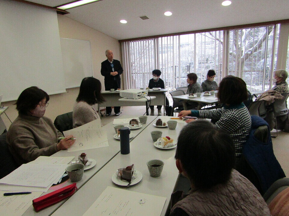 スライドショーで1年間を振り返り、ケーキを頂きながら、各班でおしゃべり会。