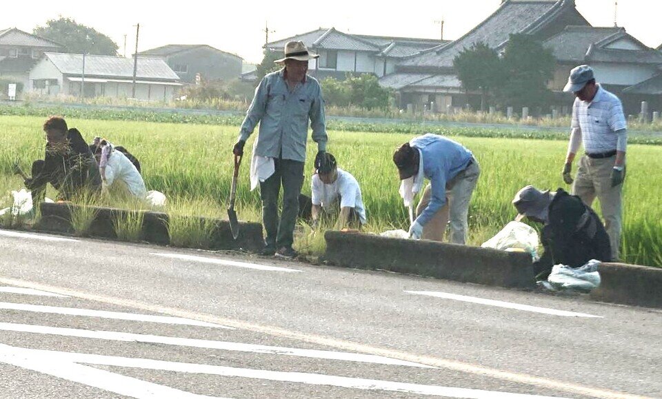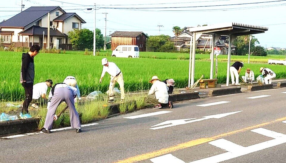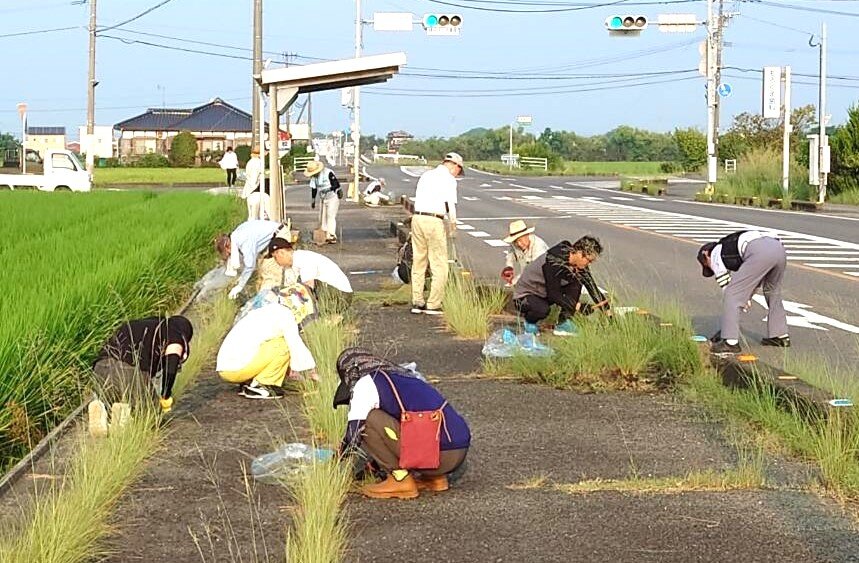 令和7年8月31日(日曜日)蓮池町を貫いている県道20号線の南側の通学路の除草作業を行いました。毎朝、交通指導員の北村さんがコツコツと除草作業をされていますので、ガソリンスタンドがある蓮池交差点から芙蓉中学校南交差点までの南側歩道の縁石の部分はほとんど草が生えていません。今回の除草作業は芙蓉中学校南交差点より東に向かって南側の歩道の除草作業を行いました。小松バス停付近です。