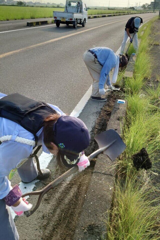 県道や側道の除草作業は県の土木事務所が刈り払い機で草を刈るのが通常ですが、北村さんはスコップで根こそぎ取り除く方法です。大変な作業です。そのために刈払い機で上の部分だけ刈った時は3日もすれば、緑色の葉が出てきます。この方法だと緑の芽が出てくるのに3か月ぐらいかかり草が無い状態が長く続きます。