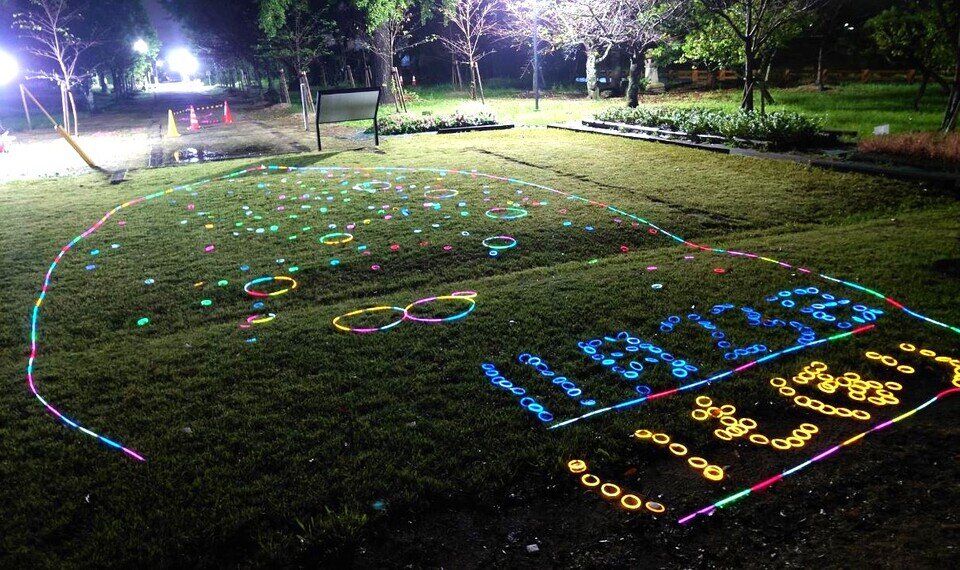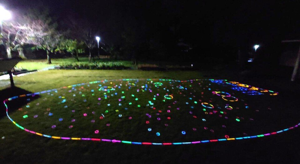 天気予報が大幅に外れ、夕方に降り始めた雨は土砂降りになり、ずぶ濡れで、「自然と環境を考える部会」の会員のみなさん、お疲れ様でした。東屋(あずまや)に避難しながら雨が上がるのを待ちましたが、光のポスター制作は途中で中止を判断しました。その後、月あかりがさしてきました、光るブレスレット3000個は子ども達に配りました。すると、その中の4,5人の子どもたちが東屋前広場で並べてくれて、思いがけない楽しい絵を作ってくれました。予想外の展開。これも、楽しいね、と好評でした。