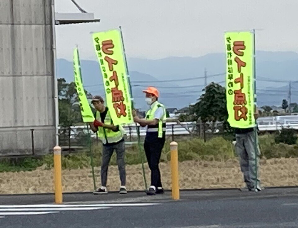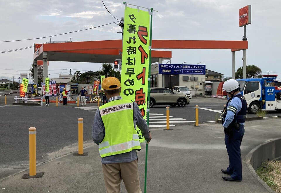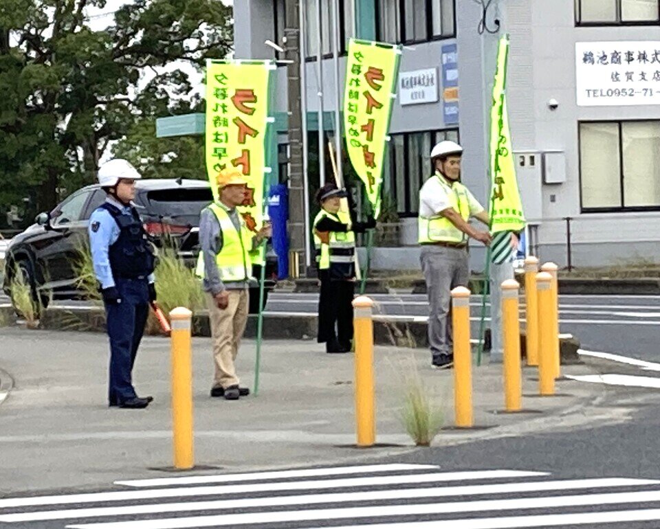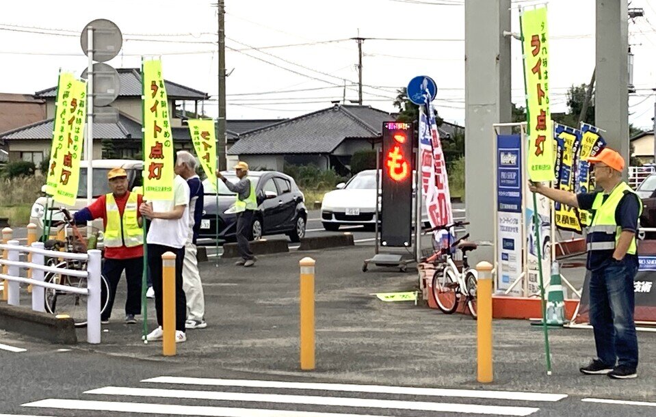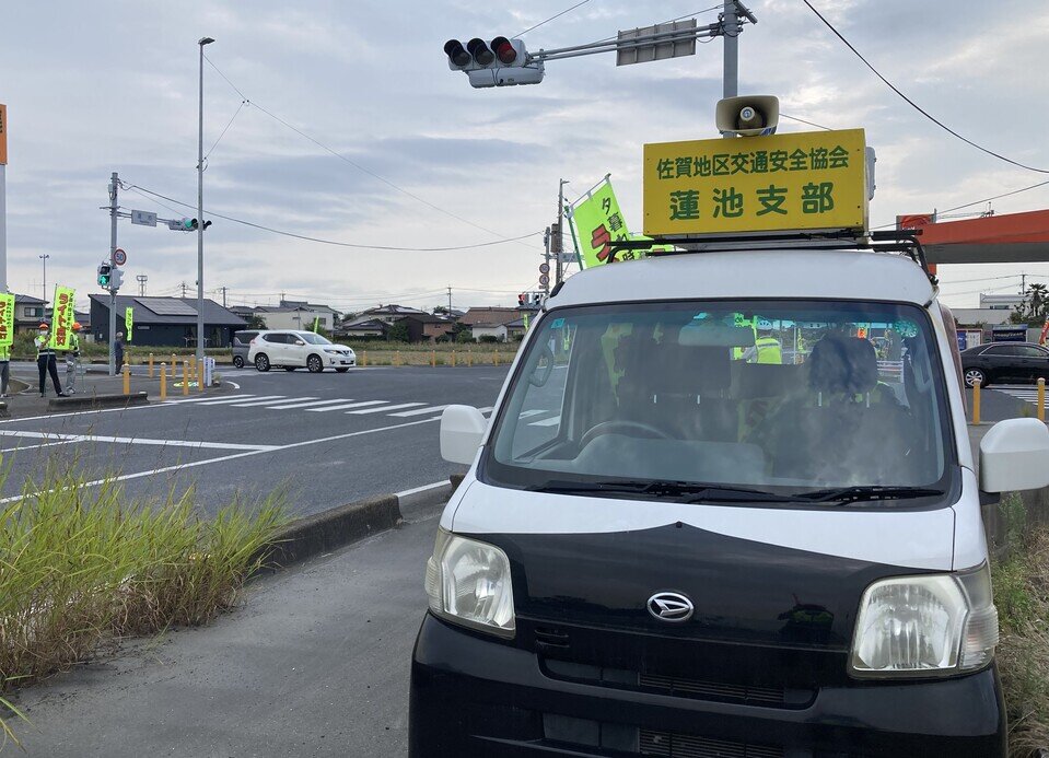 令和7年10月19日(日曜日)午後4時より蓮池地区の県道交差点(蓮池交差点)において、「夕暮れ時の早めのライト点灯運動」を実施いたしました。蓮池支部の広報車を止めて、駐在所のおまわりさんと7名の役員と9名の交通安全協会蓮池支部の評議員さん総勢17名でのぼり旗を持って交差点に立ちました。当日の午後4時は曇り空でしたが、明るさが残っていてライト点灯の必要性はなかったようですが、のぼり旗を見て、ライトを点灯する車両もちらほらありました。