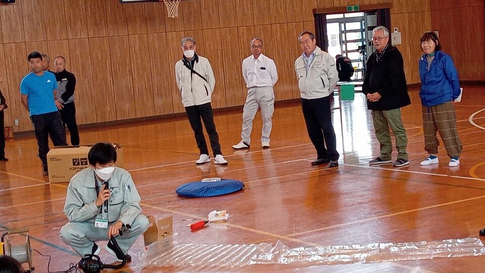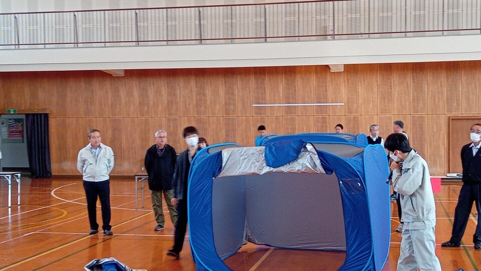 2,パーティション(テント)、エアーマットの組立てを危機管理防災課様の方に実演していただきました。