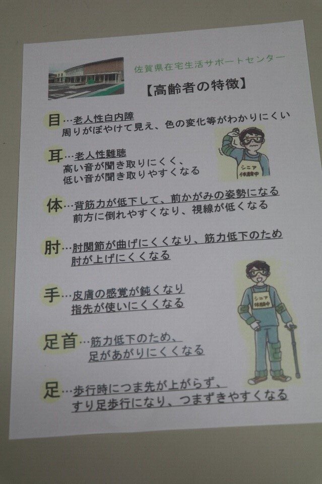 ●高齢者の特徴をはじめ「バリアフリーとは」何か「ユニバーサルデザインとは」等を学び、もし周りに困っている人がいたら、その人がどのような事に困っているのかを理解するなど相手を思いやる心を学びました。