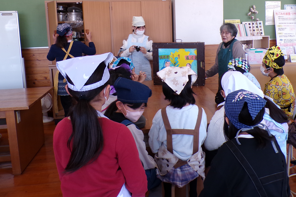 11月21日(金)地域講師の今泉多美子さんと豊田秀代さんに蓮池の伝統食「芋茶粥」について教えていただきました。蓮池の芋茶粥の由来を描いた紙芝居を見たあと、実際に芋茶粥の調理体験をしました。