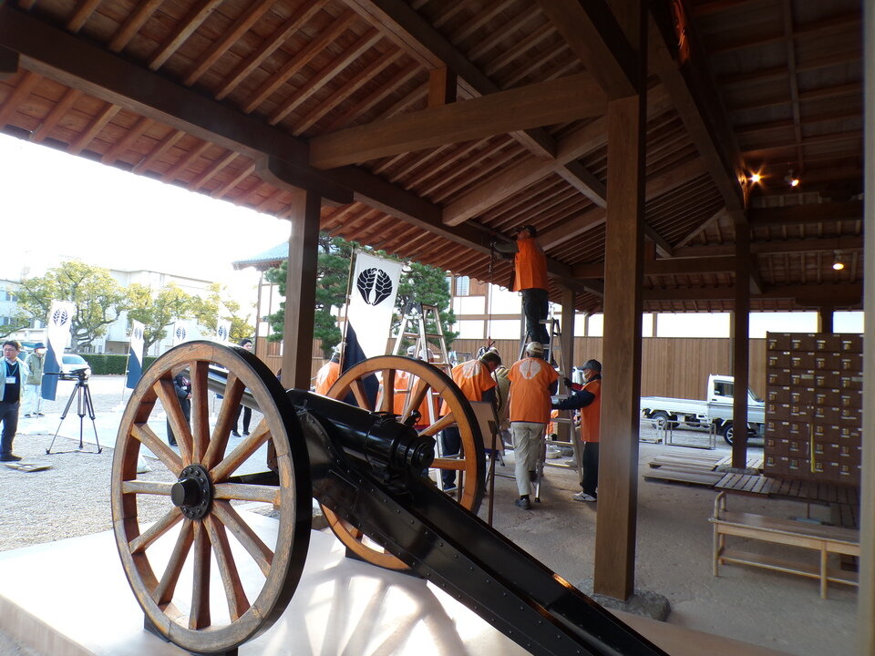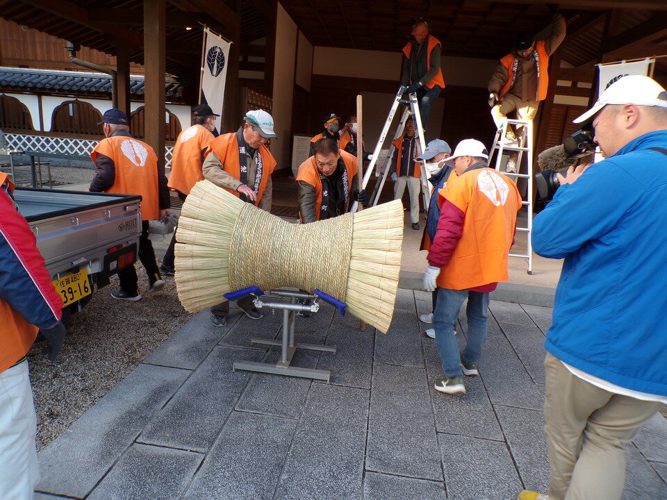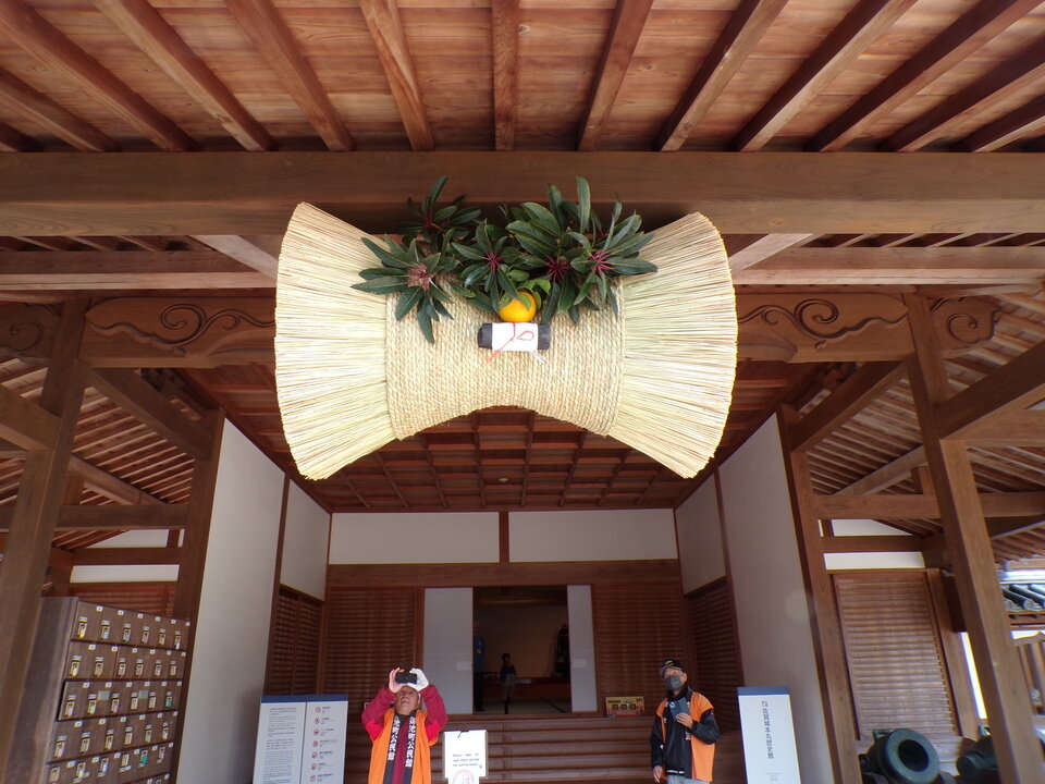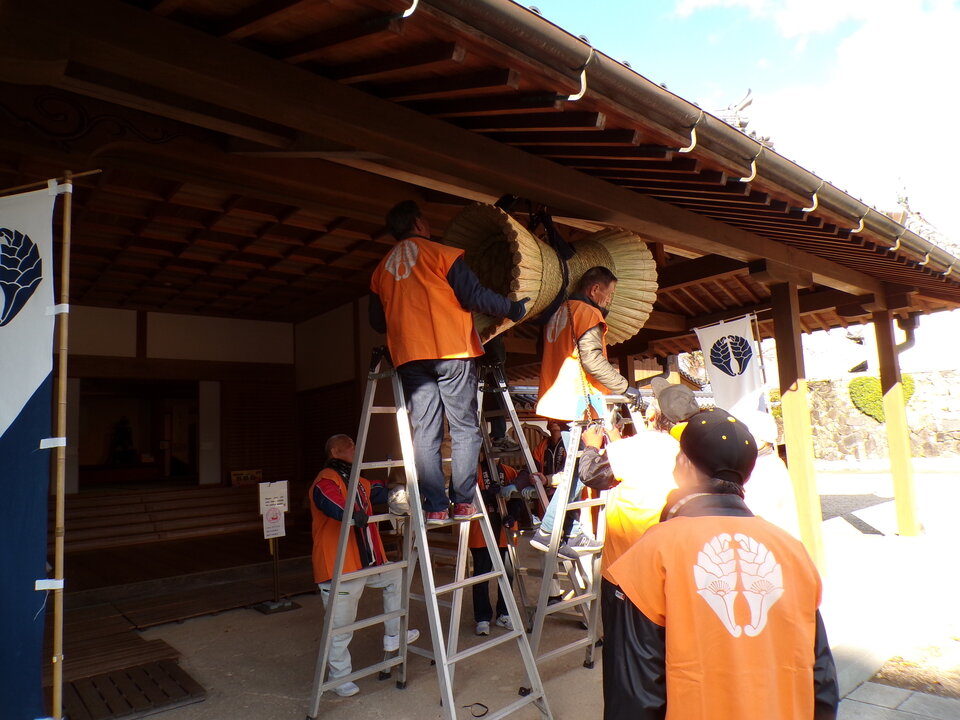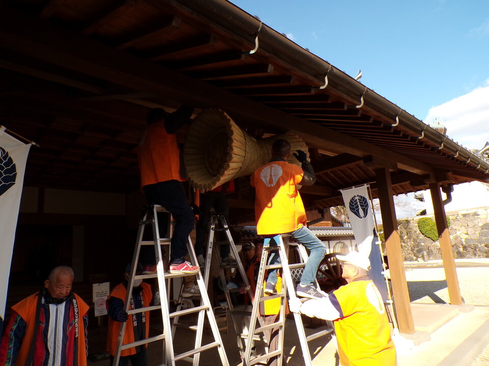 幅が120センチ、高さ80センチ、重さが約50キロの巨大な「鼓の胴の松飾り」が見事に本丸歴史資料館の玄関に飾り付けられました。