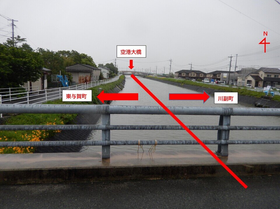 残念ながら今回は雨天のため八田江川で引き返すこととなりましたが、予定では八田江川沿いを北へ進み立野にある長泉寺(曹洞宗)まで行き、空港大橋(H6.11.28開通、全長333.8m)を渡って帰路へとつく計画でした。