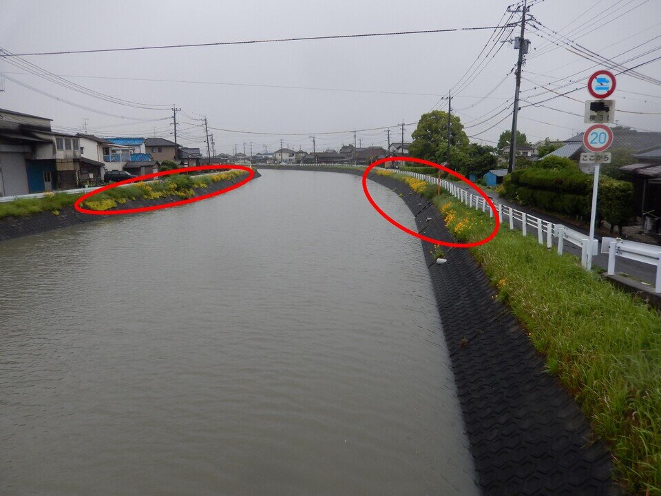 また、八田江川沿いにはオオキンケイギク(黄色い花)があちこちに咲いていました。一見きれいだなぁって思ってしまいますが、実はこの花、特定外来生物に指定されている駆除対象の植物となっていますので、近所で見かけたら駆除のご協力ください。
