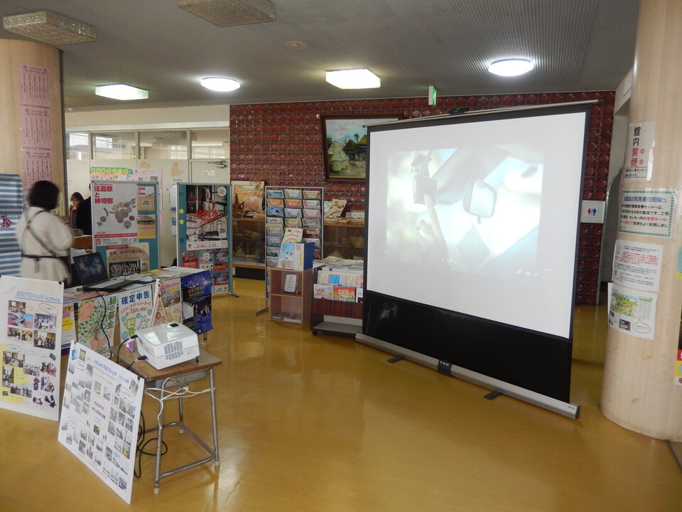 玄関を入って正面のロビーでは、「ひがしよか!写真プロジェクト」写真講座の様子、講座で参加者が撮影した写真と動画(風)に編集した成果物、レトロカフェの様子を撮影した写真などをスクリーンに映して、お客様をお迎えしました。