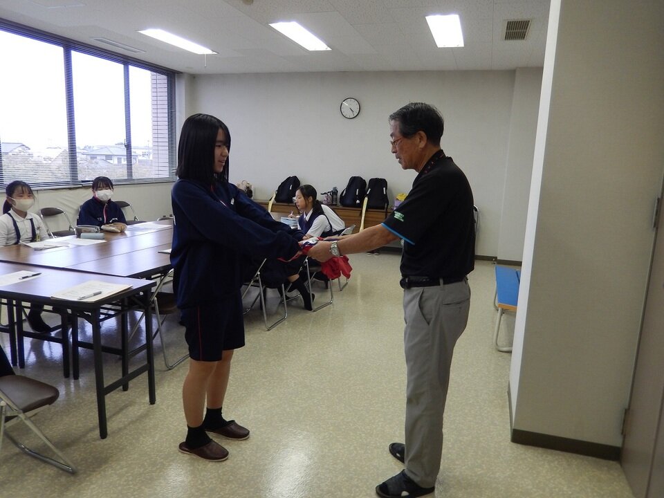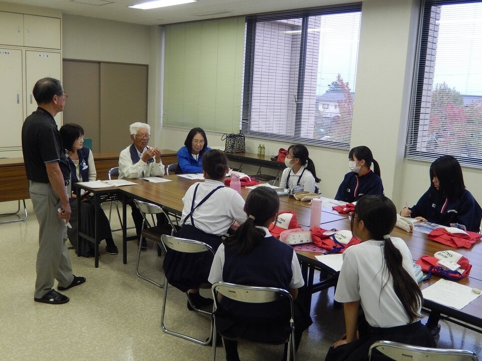 10月22日(水)の教室では、講師お二人に加えて、ひがさすの古川センター長にもお越しいただき、公民館長より子どもたちへガイド用の帽子、ジャンパー、名札の貸与式を行い、ひとりひとりにガイド本番に向けた意気込みを述べてもらいました。また、ひがさすの古川センター長より激励のお言葉をいただきました。