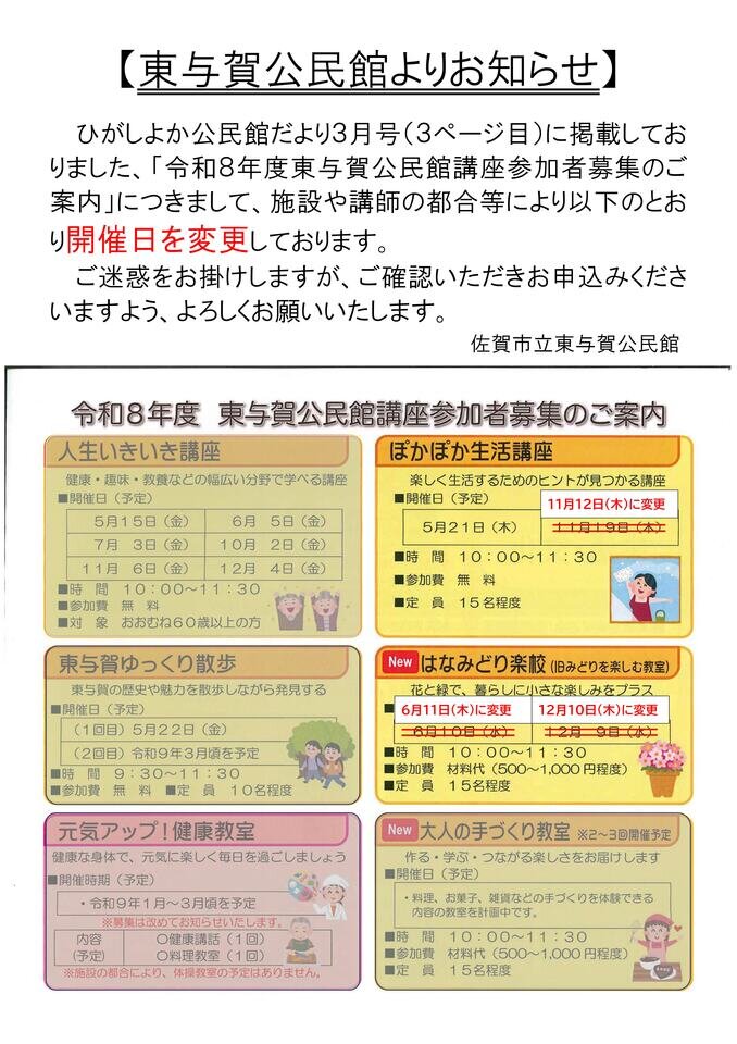 令和8年度東与賀公民館講座の開催日変更のお知らせ