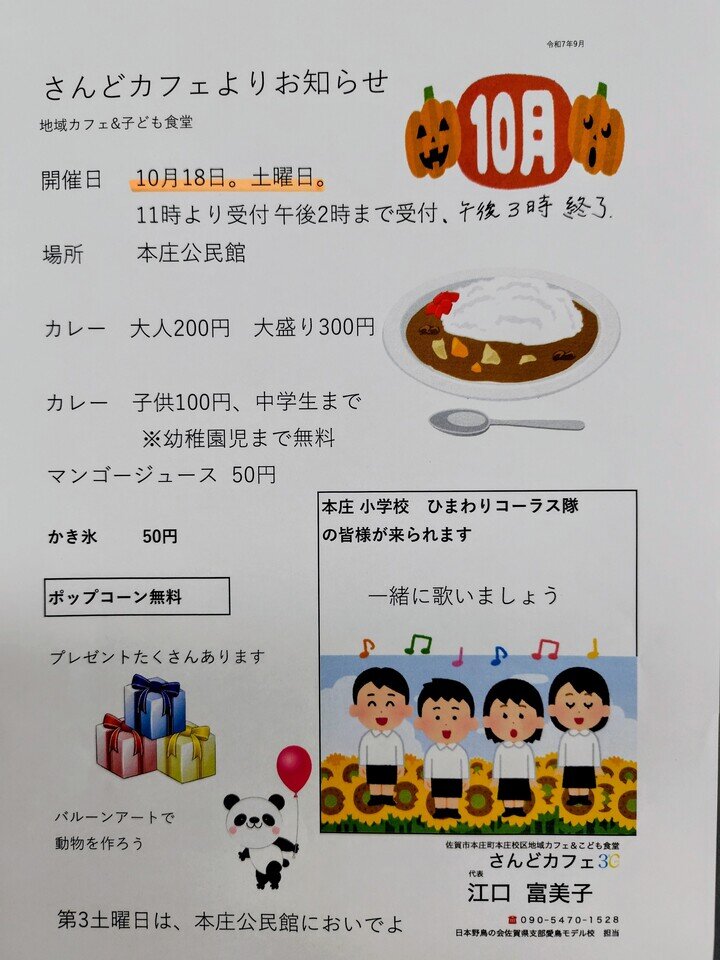 毎月第3土曜日に、本庄公民館で開催する「さんどカフェ」(地域食堂・こども食堂)