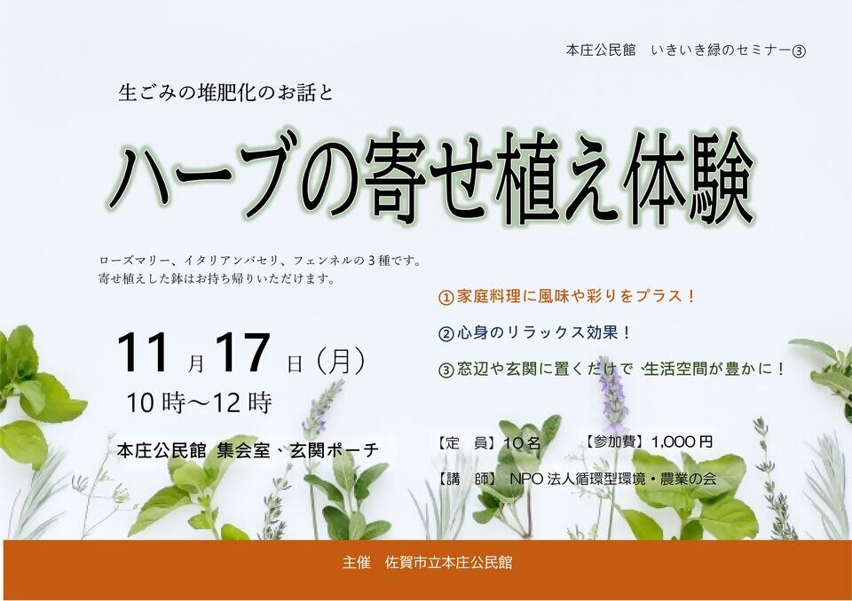 3回目のいきいき緑のセミナーは、ダンボールコンポストを使用した生ごみを堆肥化する方法を教わり、実際に堆肥化した肥料を使って、ハーブ(ローズマリー・イタリアンパセリ・フェンネル)の寄せ植え体験をします。もちろん寄せ植えしたハーブはお持ち帰りいただけます。