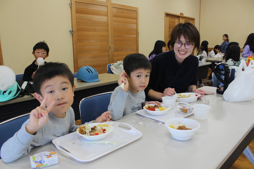 3 食事風景(皆さんカレー美味しそうですね。皆さん楽しそうです。カレーには栗のトッピングがありました。)