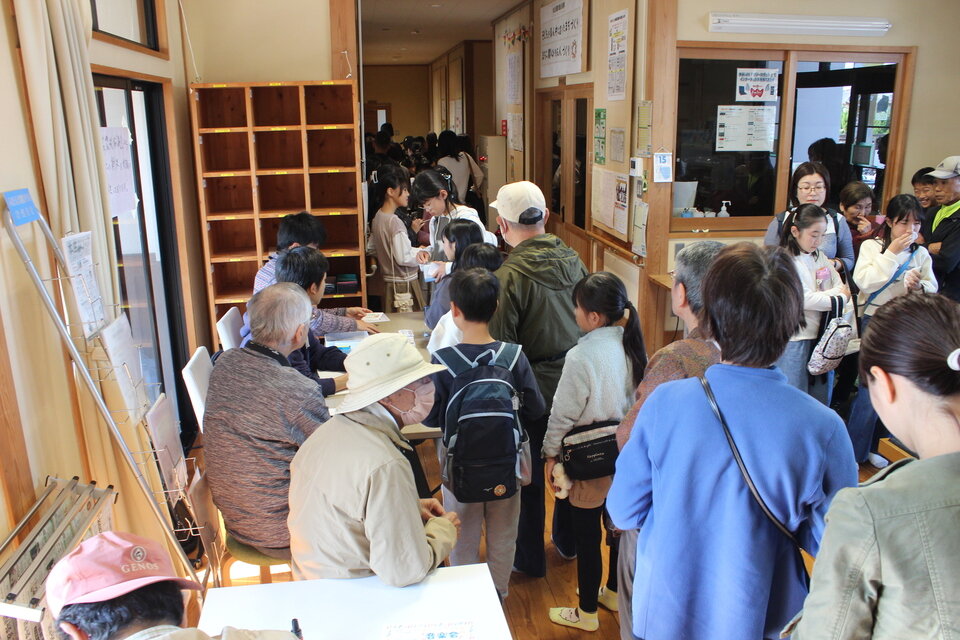 1 受付風景(開店早々ですが、すでに行列ができています。佐賀大学の学生さんが受付を手伝ってくれています。)