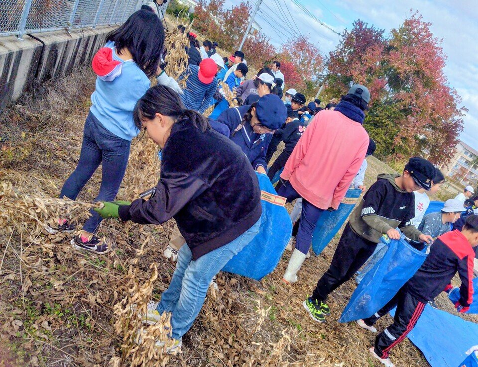 本庄小学校4年生89名は、11月末に学校近くの畑で大豆を収穫し、12月初めの週に豆腐作りを体験しました。
