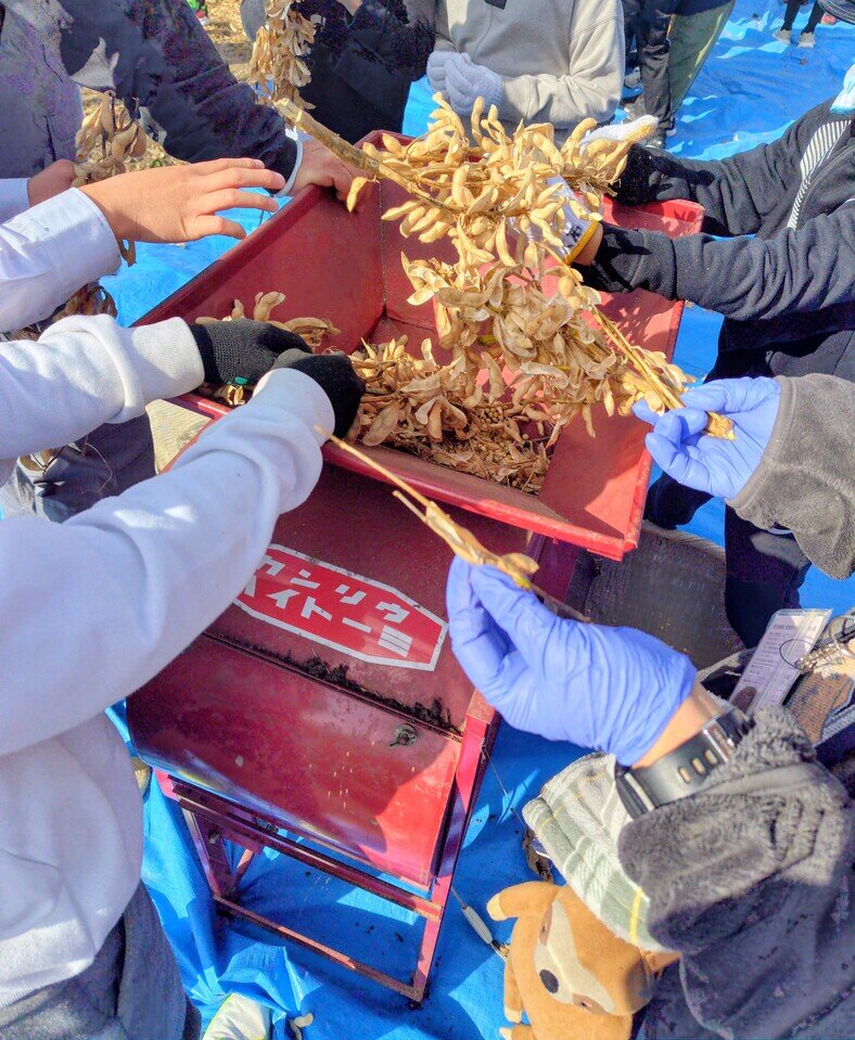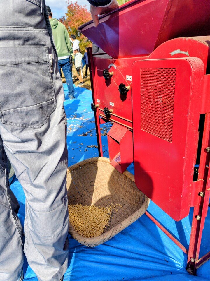 乾燥した大豆の株を根ごと引き抜き、ネットの袋の中に入れて叩き、さやから豆を落とし、脱穀機に入れて豆だけを収穫します。