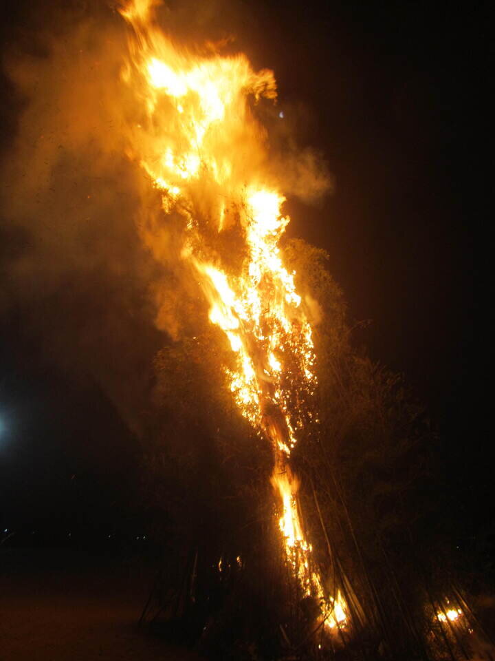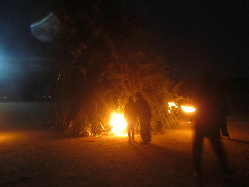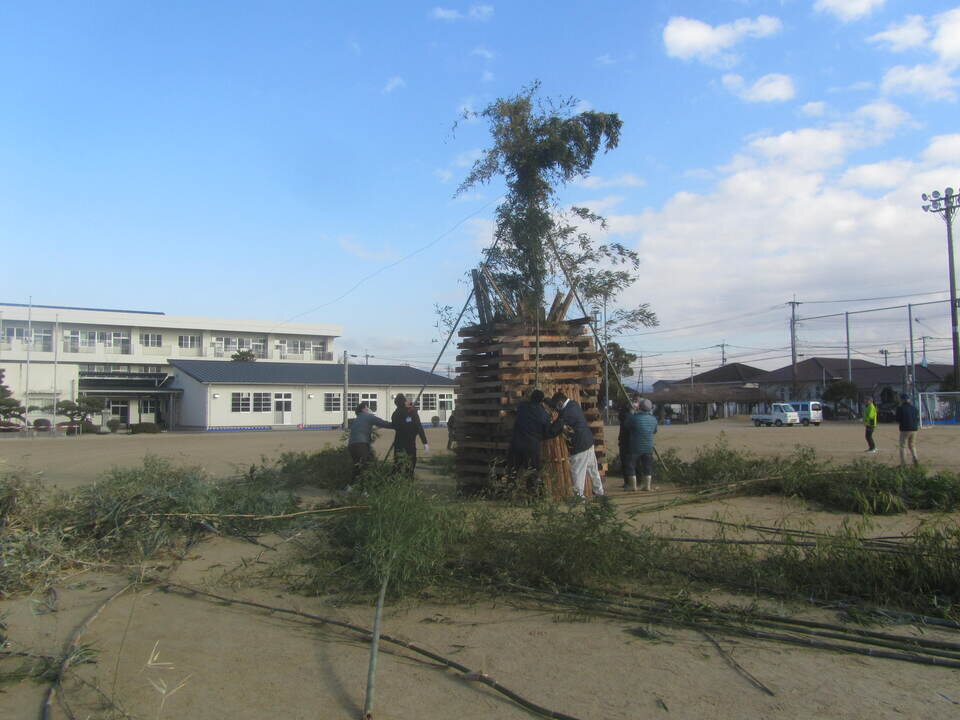 兵庫まちづくり協議会主催の「鬼火たき」が今年も1月11日(日)に兵庫小学校グラウンドで開催されました。前日から強風の下で準備されたやぐらが傾くのではないかと心配されましたが、当日の朝は小雪が舞いましたが、風も落ち着き、無事6時30分に開会。