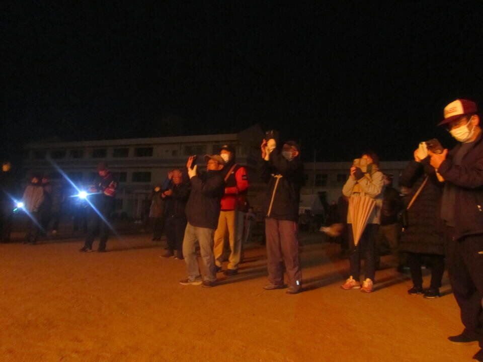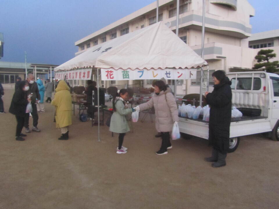 6時45分に小学生4名が代表してたいまつの火をやぐらに点火しました。勢いよく炎が燃えるやぐらの周りでは、集まった約280名の住民の方達が持参されたしめ縄などを投げ入れ、家内安全、無病息災などを祈られていました。また、会場内ではまち協の人達が訪れた住民へ春の花苗200鉢をプレゼントしました。今年が住民の皆様にとって良い1年となりますように。