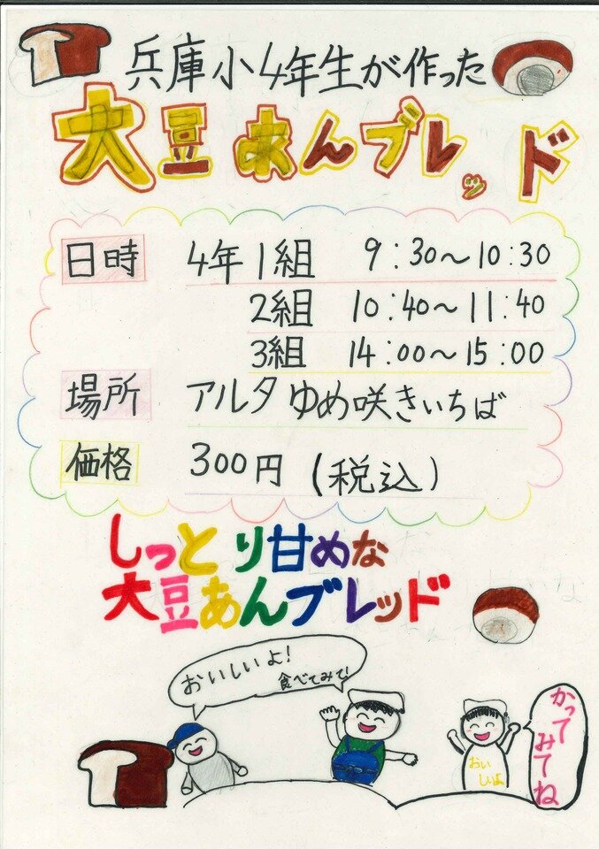 兵庫小学校の4年生が育てた大豆を使って作られた「大豆あんブレッド」が令和8年2月13日(金)に販売されます。