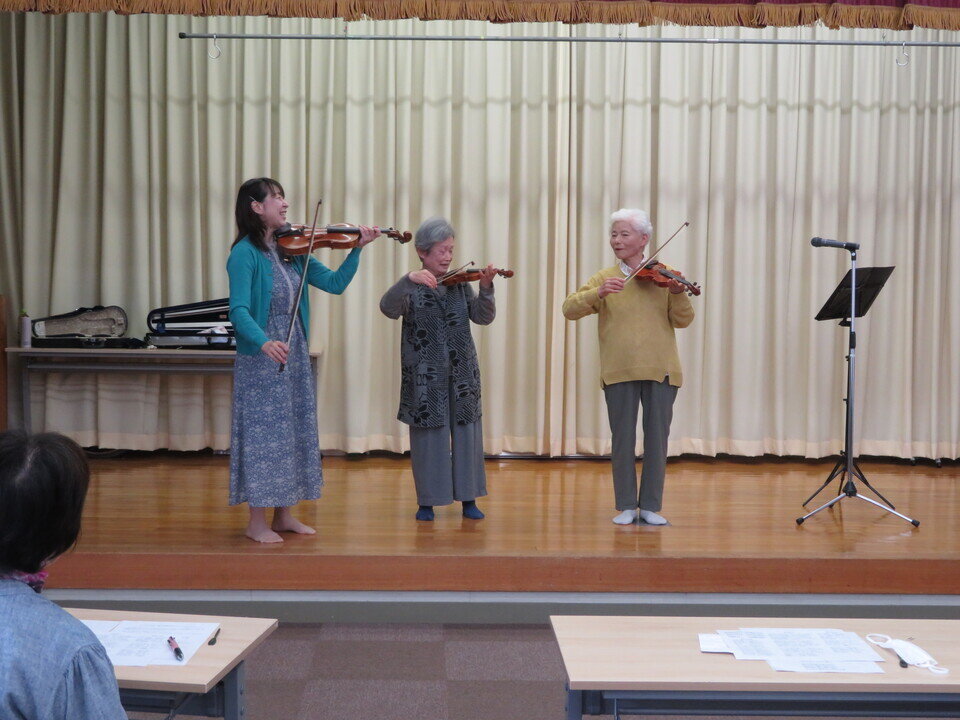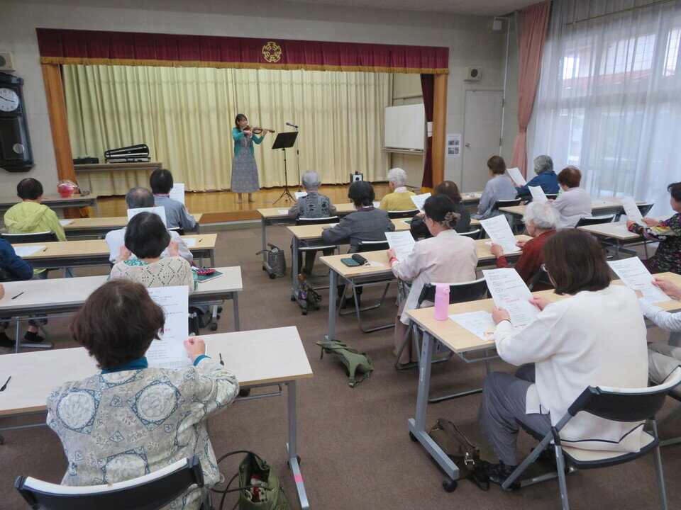 ヴァイオリンの生演奏に合わせて、「春の小川」「花」「青い山脈」「四季の歌」「瀬戸の花嫁」などを歌いました。