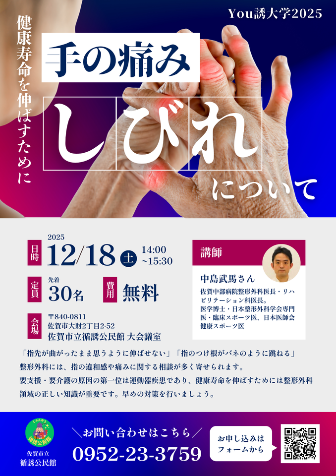 今回のYou誘大学2025は、「手の痛み」や「しびれ」について、専門の整形外科の先生からお話を聞き、対処法を学ぶセミナーです。