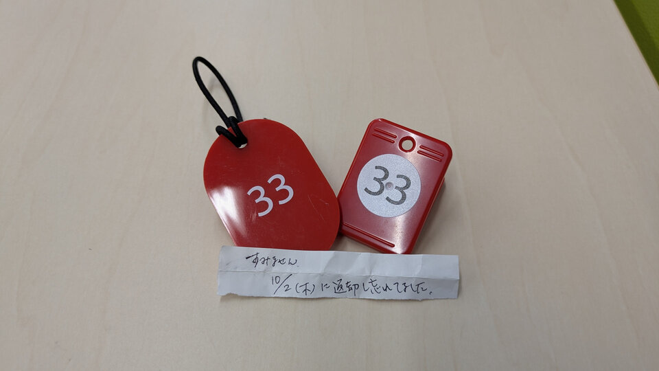 履き物用のクロークチケットの半券(No.33)を誤ってご自宅に持ち帰られたのでしょう。今朝、事務室のドアに返却されていました。ありがとうございました。