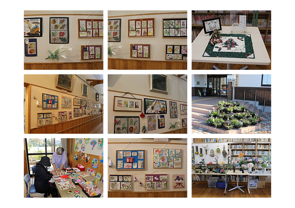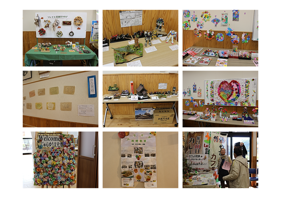 実用書道、かな書道、パプリカ料理教室(活動ポスター)、循誘俳句会、じゅん遊絵手紙サークル、ケント100S(プラモデル)、大園てる代(着物リメイク)、境 久子(編み物)、フレール・クレール佐賀(寒冷紗の花)、ソレイユ花遊びクラブ(フラワーアレンジ)、やすらぎカフェ(活動ポスター)、循誘小学校(児童の絵)、ゆるふわ折紙くらぶ、循誘歴史クラブ(活動ポスター)