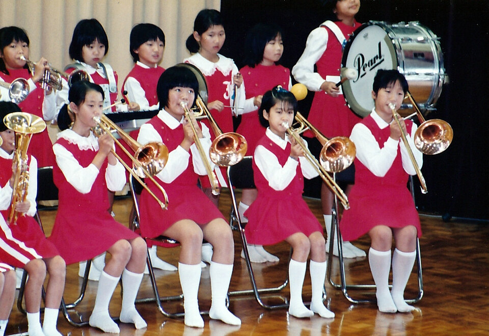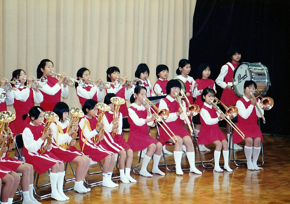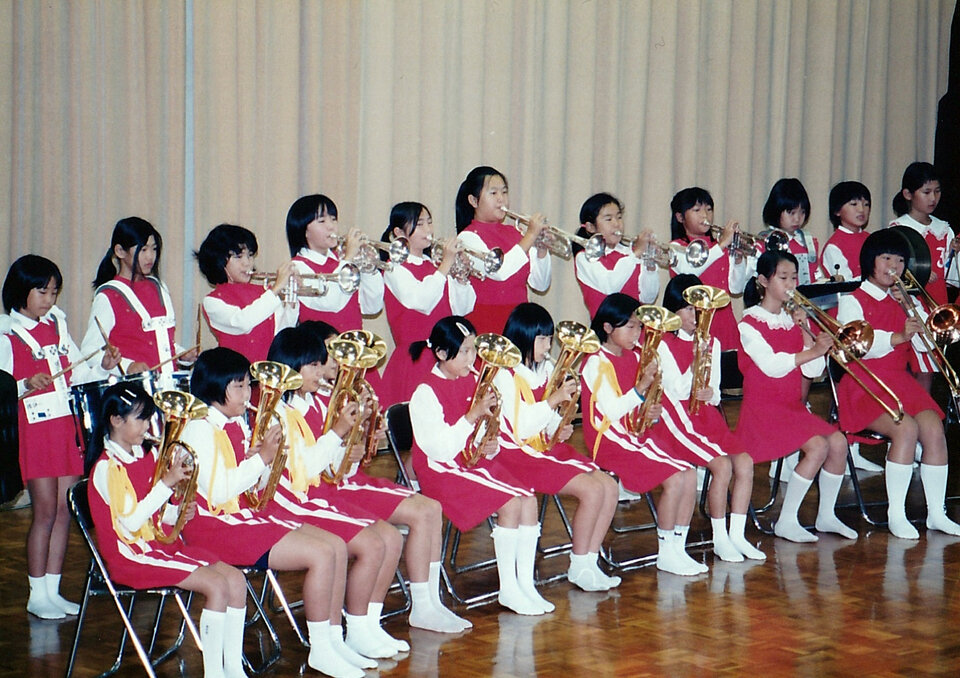 循誘小学校体育館で行われていた「循誘ふるさと祭文化祭」。当時の小学校金管バンドの児童達でしょうか。今はそれぞれの地でご活躍のことでしょうね。