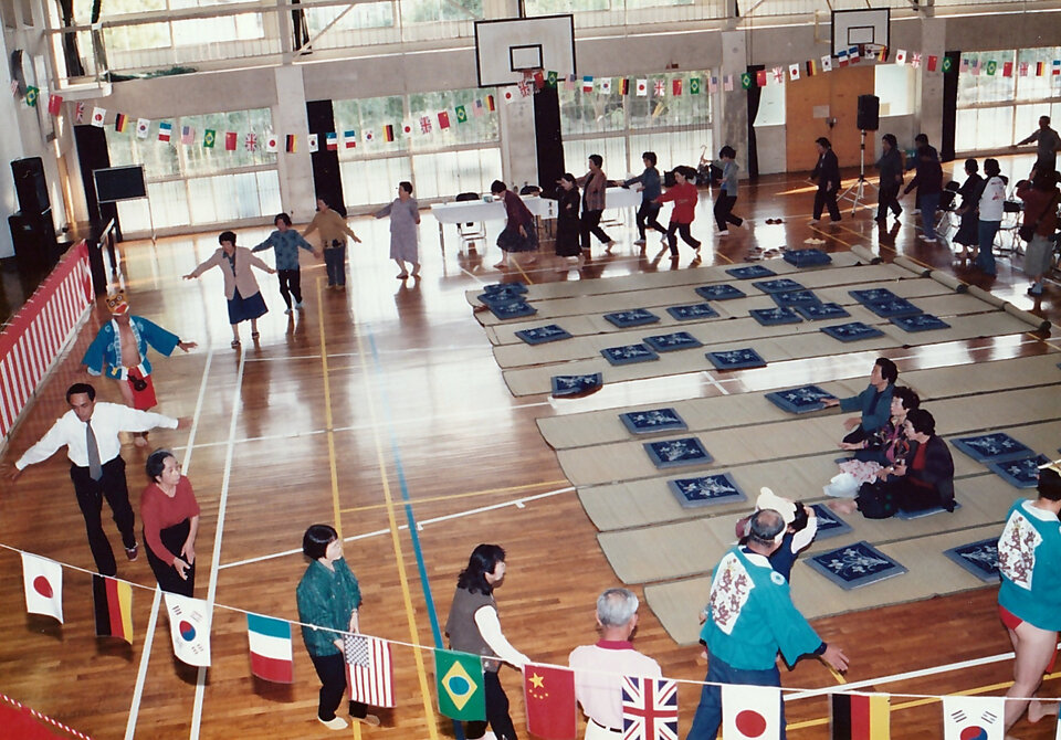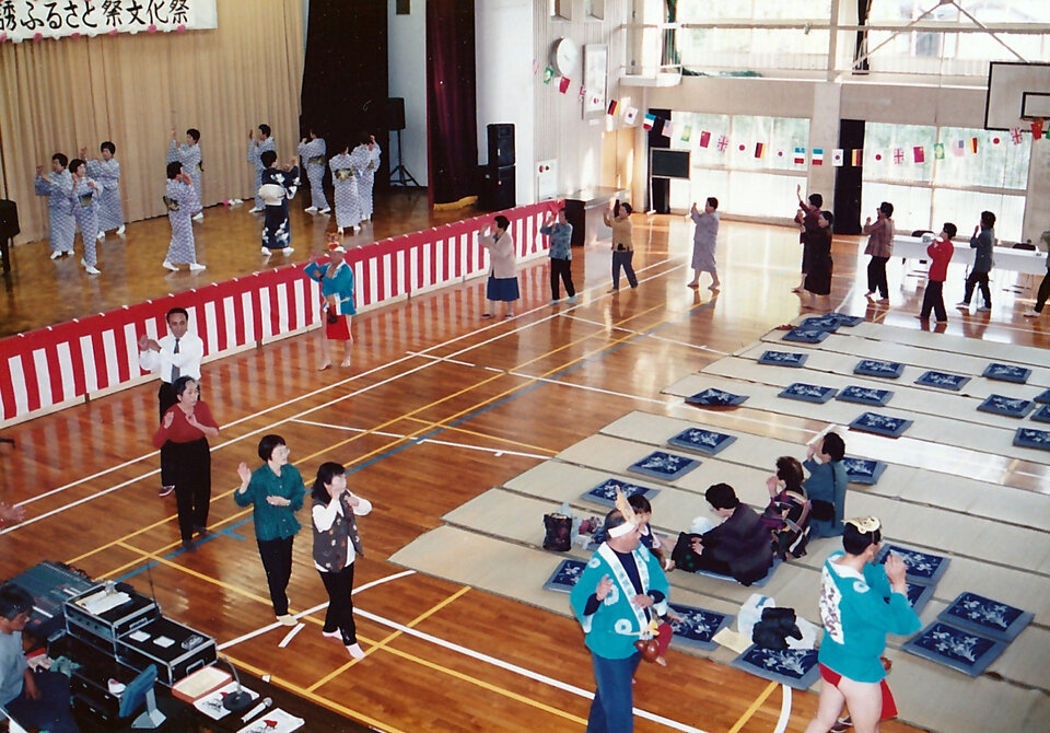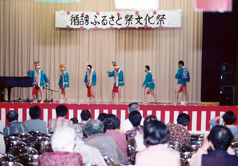 循誘小学校体育館で行われていた「循誘ふるさと祭文化祭」。ユニークな格好での男性踊り。