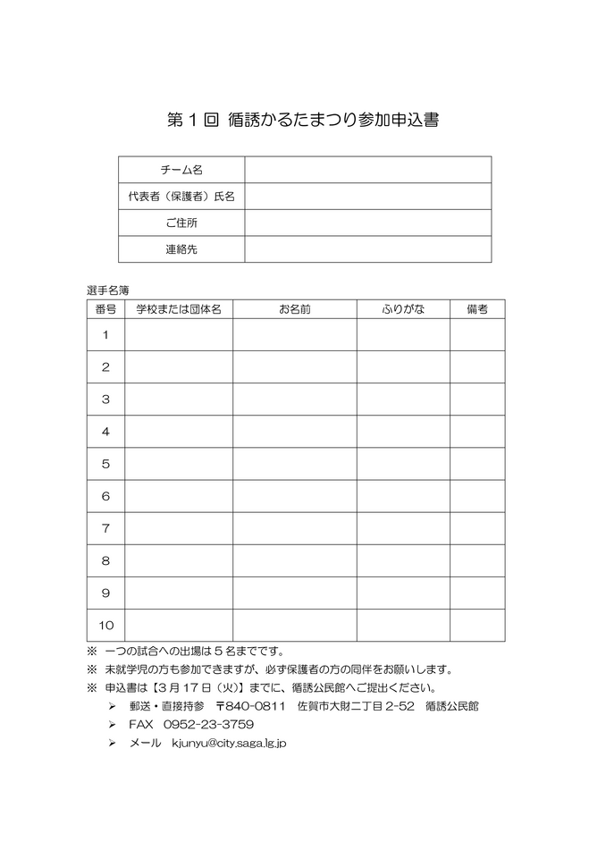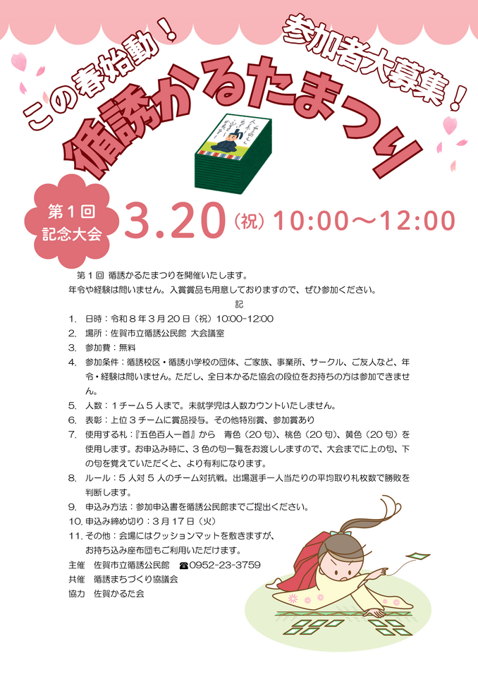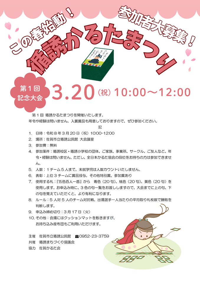 - 参加条件:循誘校区・循誘小学校の団体、ご家族、事業所、サークル、ご友人など、年令・経験は問いません。ただし、全日本かるた協会の段位をお持ちの方は参加できません。