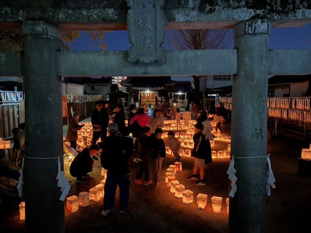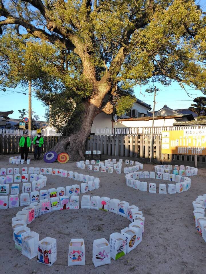⑤八坂神社(日が落ちる前のひなまつり灯明ナイト。後ろにそびえ立つのは樹齢600年の大楠)