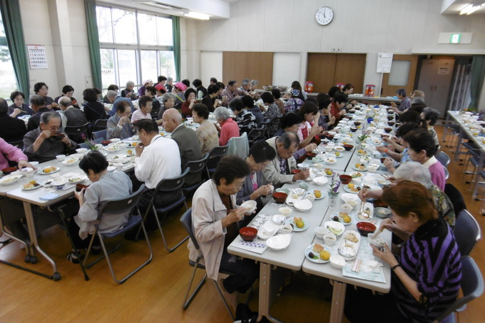 10月13日(金)開成公民館で今年度第2回目の「ふれあい会食会」をボランティアひまわりと社会福祉協議会の主催で行いました。一人暮らしの高齢者を対象に約60名の参加があり、メニューはさつまいもご飯・タンドリーチキン・なすのマリネ・茶わん蒸しのきのこあん等季節の食材を使った料理を美味しくいただき、食後の演芸は「華の会」の皆さんの舞踊や歌で楽しみ、最後は全員で「炭坑節」を踊り楽しいひと時を過ごしました。