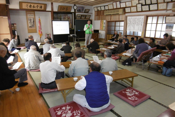 10月24日 江頭公民館で「江頭びわの会」(会長 橋本 恭二 会員50名)主催で高齢者の交通安全対策とニセ電話詐欺について、佐賀市生活安全課の防犯アドバイザー 志久 正敏さんを招いて講習会が行われました。橋本会長の挨拶の後、全員で「佐賀弁ラジオ体操第一」を楽しく行い、講習会が2時間おこなわれました。来月は日帰り研修ツアーで紅葉見学を兼ねて、祐徳稲荷・多良温泉等が予定されてます。