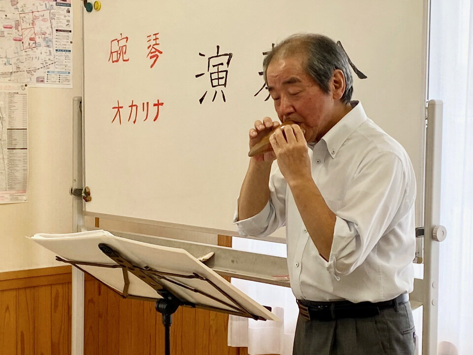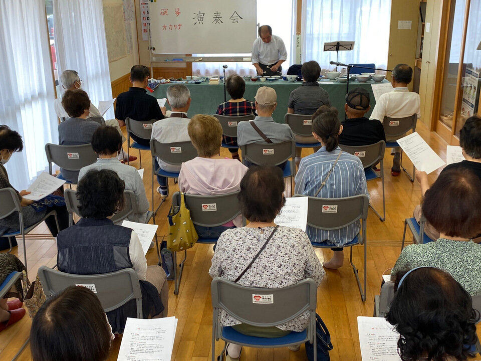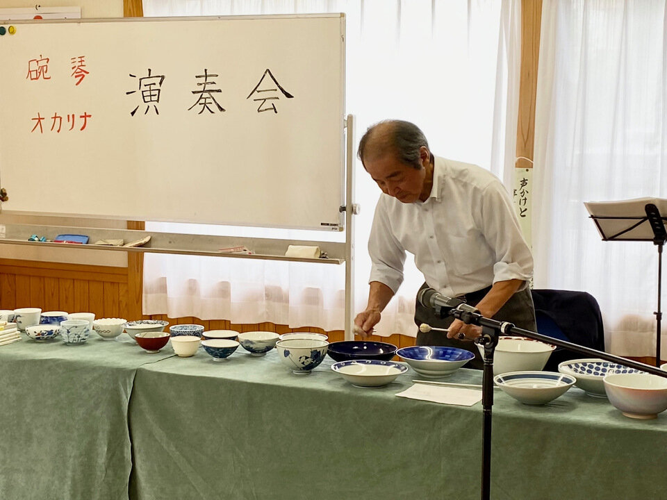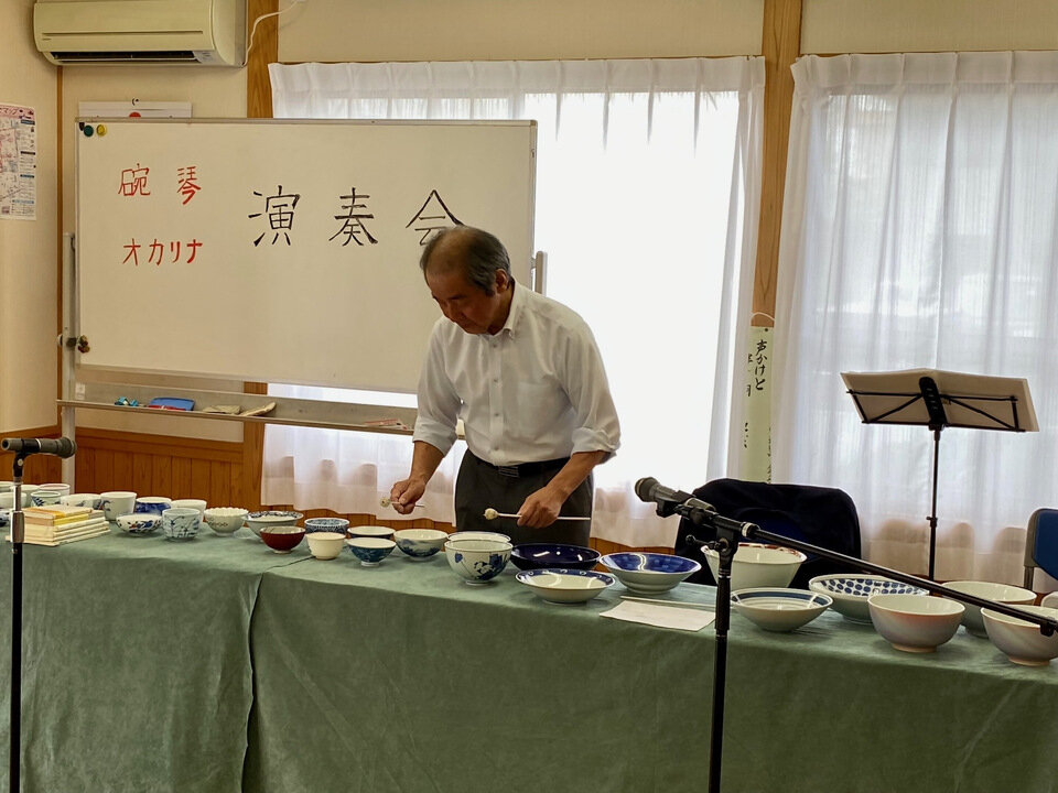 令和5年6月23日(金)、開成5丁目の自治公民館において、碗琴奏者の筒井孝司さんを招いて、有田焼のお碗を楽器に仕立てた「碗琴」の演奏会が開かれました。