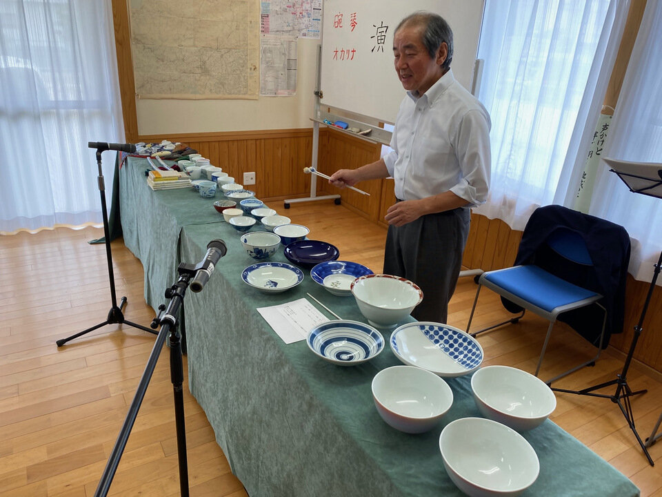 筒井氏は、これまで600回以上の演奏会を国内外で開いてきており、同じく有田焼のオカリナや横笛も奏でる、碗琴の第一人者としてご活躍をされています。