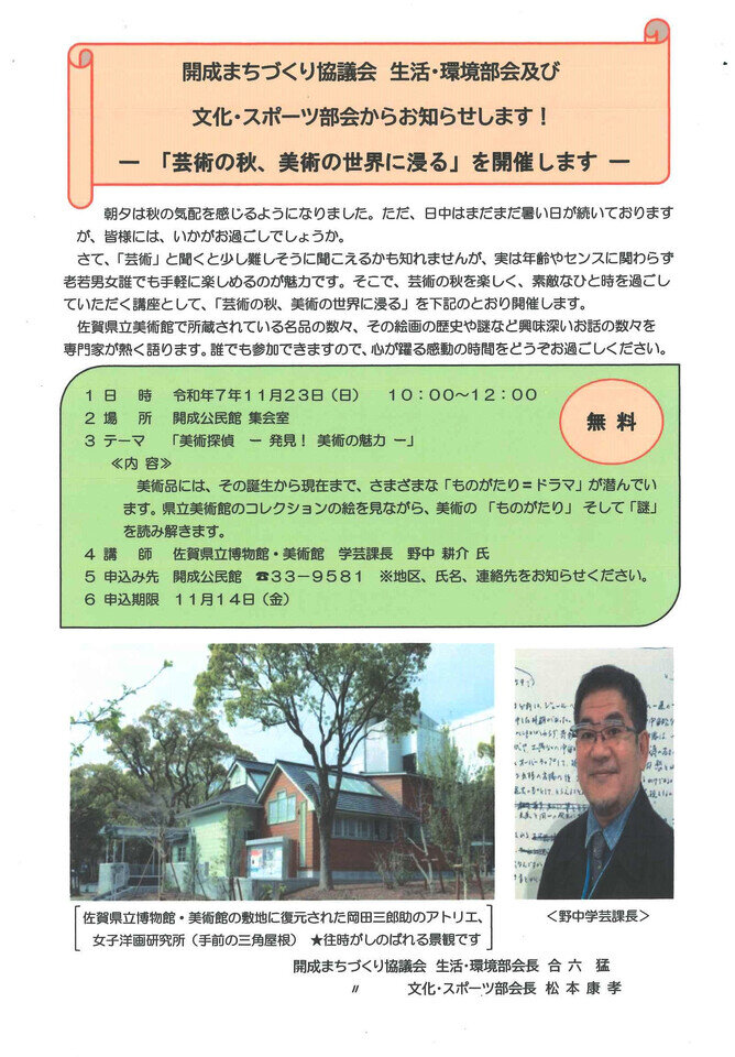 開成まちづくり協議会 生活・環境部会、文化・スポーツ部会より、案内が届きました。