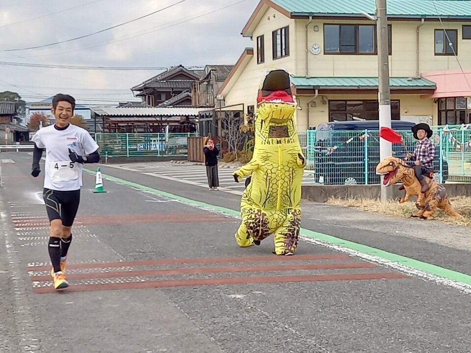 コースの途中で、恐竜(の着ぐるみ)が応援してくれるなど、思わぬサプライズもありました。恐竜に追いかけられて、記録がよくなった?という話があったかどうかは定かではありませんが、ポカポカ陽気の中、爽やかな大会となりました。結果は、開成公民館だより2月号にてお知らせする予定です。![]()