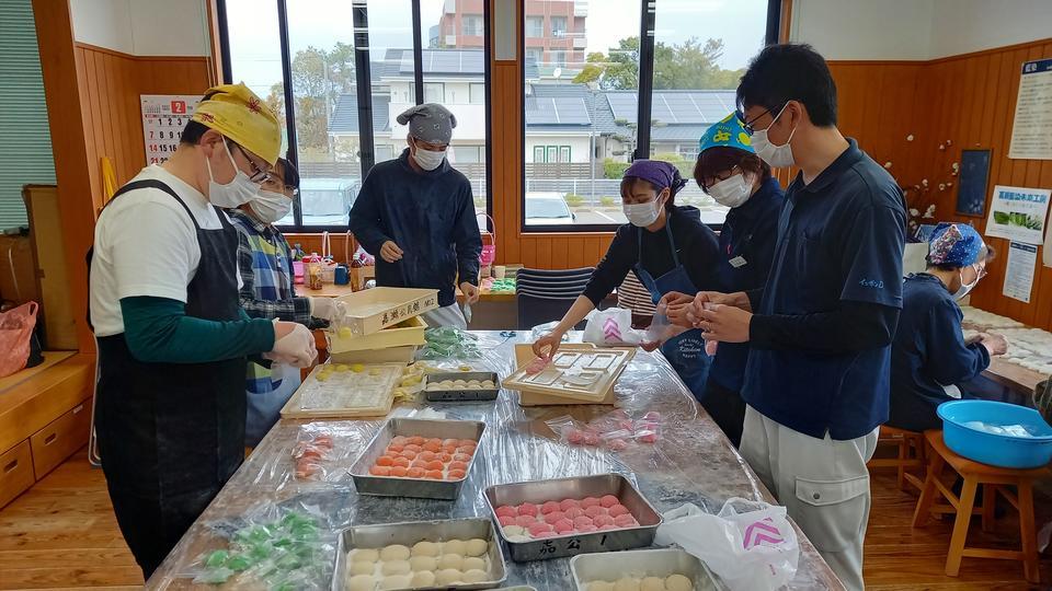 途方もない量に思えましたが、藍染め工房の火力の強いコンロが使えたこと、餅つき機が2台あったこと、集まっていただいたみなさんの手際が良かったこともあり、餅投げ用の餅が1600個以上できあがりました!![]()