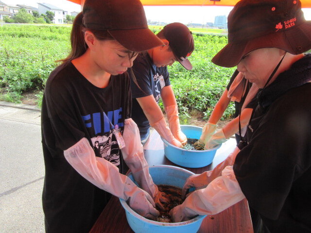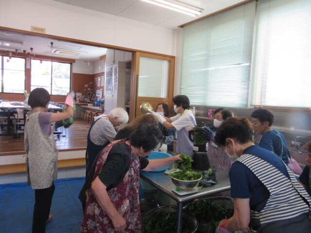5月に6年生と一緒に苗植えをした藍の生葉をミキサーで紛砕し水を加えて液体を作ります。その藍の液に何度も揉み込んで藍の色に染め上げます。