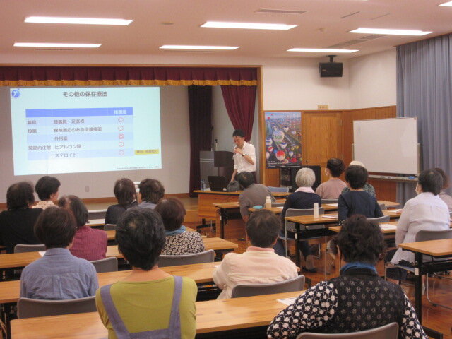 第3回目は、9月30日(火)に中島武馬さん(佐賀中部病院整形外科医長)をお迎えし「膝関節・股関節の痛みについて」お話ししていただきました。 膝関節、股関節の痛みは、関節の変形が主な原因であることなど詳しく説明していただきました。最新の手術や新しい治療法も紹介され、症状によって治療法も変わるため、痛みがある時はまず病院に相談することをすすめられました。