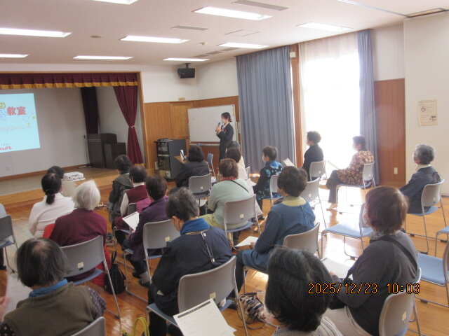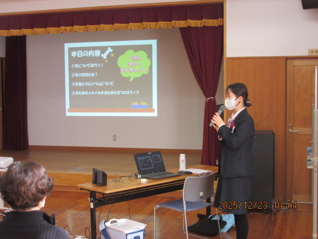 12月23日(火)坂本さん(佐賀県ヤクルト販売㈱)を講師に迎え、「毎日骨骨教室」というテーマで開催しました。骨を強くするにはカルシウムが大切で、どうしたら上手にカルシウムを摂れるか3つのポイントをお話ししていただきました。 ①腸内環境を整える ②上手にカルシウムを摂る ③適度な運動 栄養をしっかり吸収するためにも腸を良い状態に保つことやカルシウムの吸収を高める栄養素をとること、適度な運動は骨を強くすることを学びました。